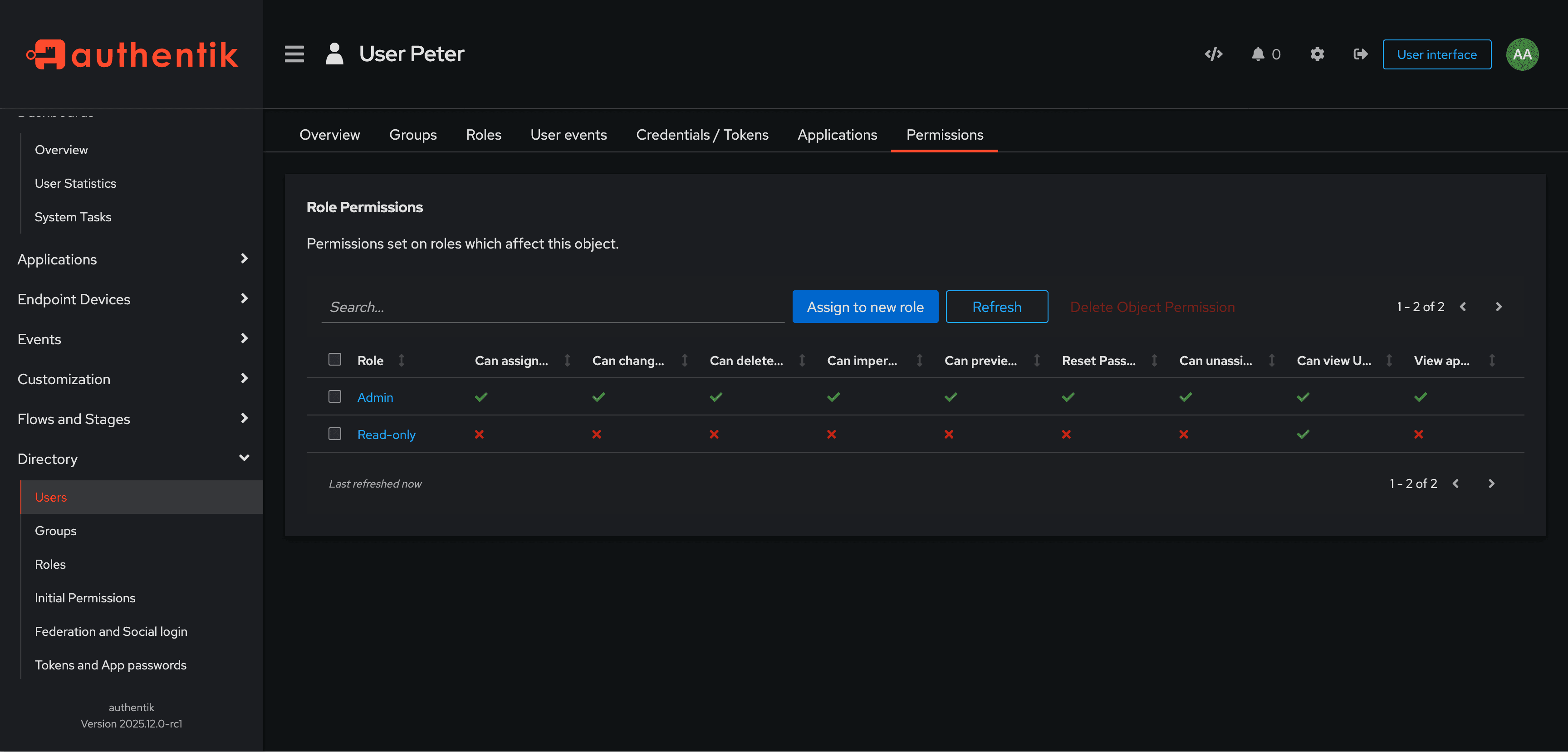 From 2025.12, authentik's access control is fully role-based. Before 2025.12, Admins could assign permissions to individual users. To mimic this behavior of "User permissions", an Admin can assign a user to a role that has the required permissions.